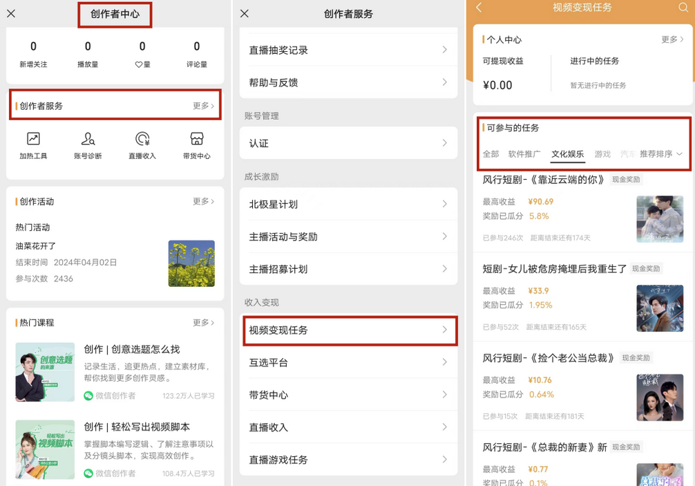 满足“有效关注数100人以上”及“符合内容规范”两个条件的创作者,通过“创作者中心 — 视频变现任务(点击更多)— 文化娱乐”的路径,就可以领取短剧推广的视频号小任务。